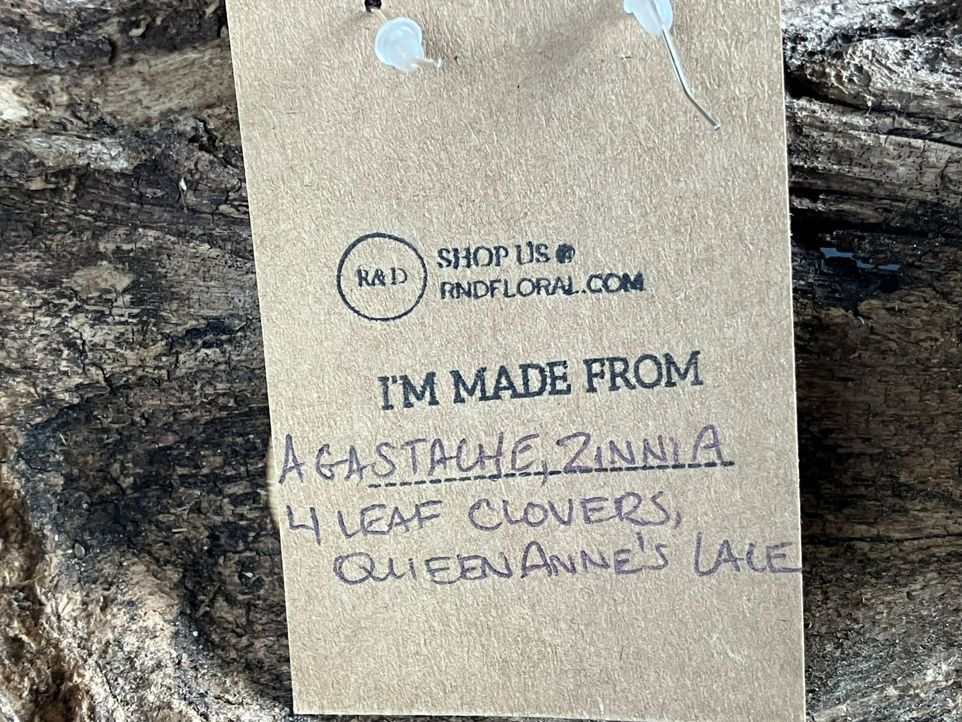 A keepsake of nature’s quiet fortune. Real four-leaf clover, agastache, and Queen Anne’s lace are pressed and preserved in clear resin on sustainably sourced wood — each pair carrying a whisper of luck, grace, and wild bloom.