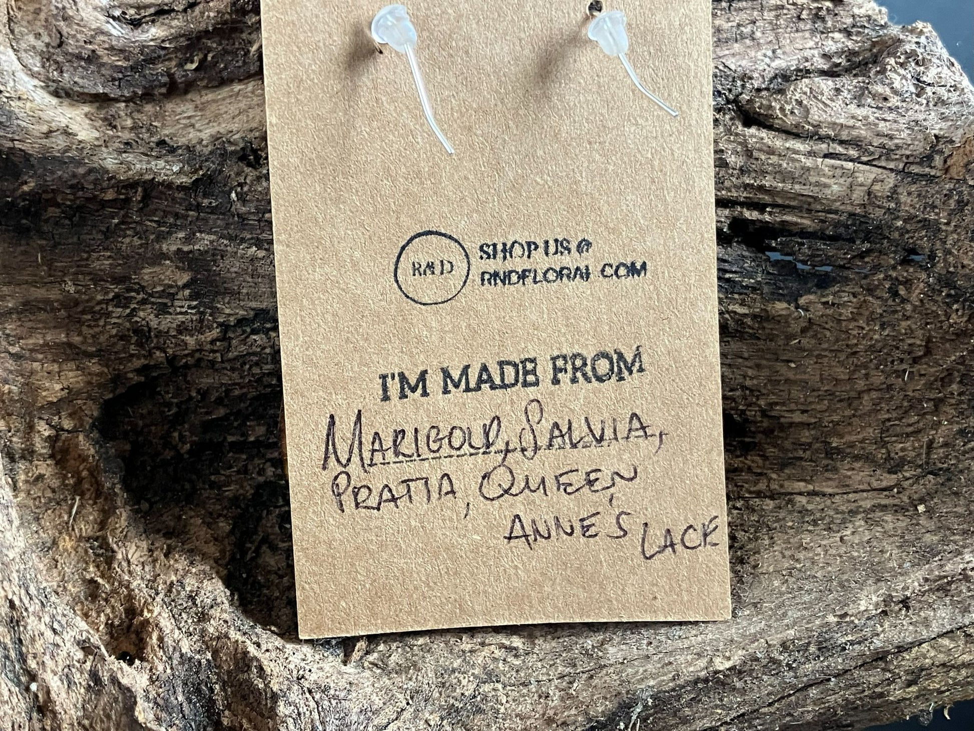 Genuine pressed botanicals: marigold, salvia, pratia & Queen Anne’s lace