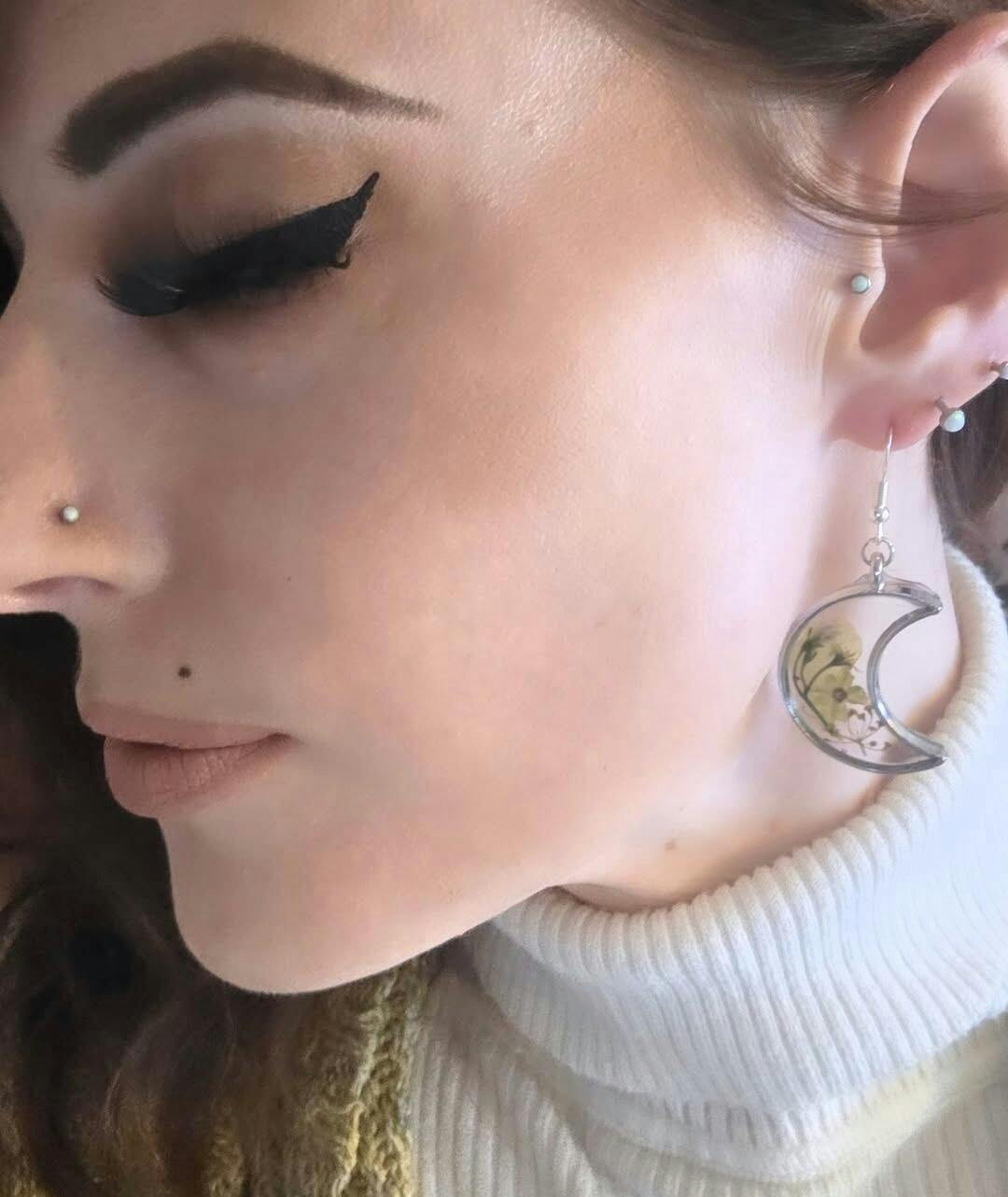Capture celestial charm with these handmade moon-shaped earrings, featuring real Hypericum blooms encased in a silver metal frame. Each delicate blossom preserves the bright, cheerful beauty of Hypericum, evoking sunny meadows and the natural vibrancy of wildflowers.